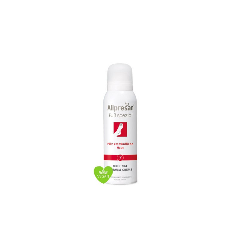 - Voor schimmelgevoelige huid- Medische voetverzorging met biomimetische (huidgerelateerde) lipiden- Bevat 10% ureum en clotrimazol- Voor therapiebegeleidende verzorging van voetschimmel- Versterkt de huidbarrière en gaat zo de ontwikkeling van voetschimmel tegenGeschat wordt dat 1 op de 3 mensen last heeft van voetschimmel. Het risico op infectie neemt toe wanneer de huidbarrière beschadigd is, bijvoorbeeld wanneer de huid gezwollen is door vocht of gebarsten is door uitdroging. De schuimcrème Allpresan voet speciaal nr. 7 is ontwikkeld voor speciale, aanvullende verzorging in het kader van voettherapie. De combinatie van 10% ureum, glycerine en biomimetische (huidgerelateerde) lipiden verhoogt het vochtgehalte van de huid op de voeten en helpt de huidbarrière te regenereren. De natuurlijke beschermende functie van de huidbarrière wordt versterkt en het risico dat potentieel besmettelijke ziektekiemen en schimmelsporen de huid binnendringen wordt verminderd. Met clotrimazol.Medische voetverzorging met biomimetische (huidgerelateerde) lipiden plus 10% ureum en clotrimazolVoor bijzondere, aanvullende zorg als onderdeel van voettherapieVormt een ademend beschermnet dat is gebaseerd op het actieve principe van modern textiel (geen warmte- en vochtophoping) en beschermt de huid tegen invloeden van buitenaf, zoals b.v. vocht en zweet dat op de huid ligt, beschermt zonder de natuurlijke huidfuncties aan te tasten.Textiel kan direct na gebruik weer worden aangetrokken. Er is geen risico op uitglijden.Zonder geur- en kleurstoffen.100% vegan.