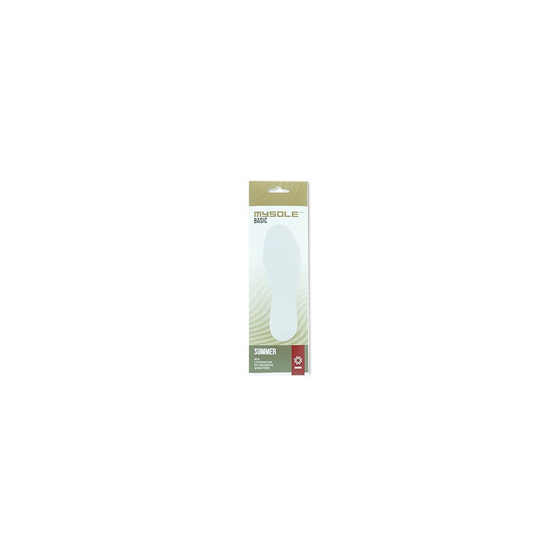 De Mysole Basic Summer is een ademende inlegzool voor ieder schoentype. Deze inlegzool kan met blote voeten in de schoen gedragen worden. De toplaag van deze zool is gemaakt van 100% katoen en voelt daarom zeer comfortabel aan. De tussenlaag van de inlegzool bevordert vochtopname door de actieve koolstof. De onderlaag bestaat uit ademend latex-schuim wat zorgt voor extra demping. Door de goede luchtdoorlatende eigenschappen is deze inlegzool uitermate geschikt voor de zomermaanden. Kan met de hand gewassen worden tot 30 graden. Uitgebreide productspecificaties en toepassingsmogelijkheden van deze inlegzool vindt u op www.mysole.nl.