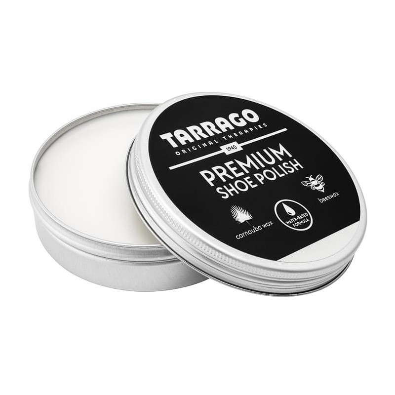 Harde schoensmeer verpakt in het aluminium blik met schroefdop. Ideaal om mee te polieren. De shoepolish is op waterbasis en bevat bijenwas om het leer zacht te maken en te reinigen en carnaubawas voor een langdurige glans en waterafstotendheid. Bevat veel pigment voor een goede dekking en bescherming. Tarrago Premium Shoe Polish is milieuvriendelijk en kan met luchtvracht verzonden worden.