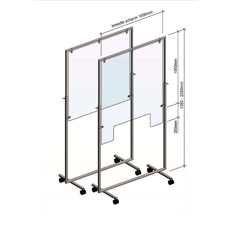 Door dit verrijdbare scherm, welke in hoogte verstelbaar is (onderkant scherm 850 ? 1.350 mm), wordt de kans op het verspreiden van het virus van patiënt op u en vice versa flink verlaagd.Specificaties:Hoogte : 1.850 ? 2.350 mm verstelbaarBreedte : 1.000 mm Plexiglas schermHoogte : 1.000 mmBreedte : 1.000 mmVoor dit artikel gelden afwijkende verzendkosten. Voor meer info svp contact opnemen met verkoop@dumco.nl of telefonisch.Na bestellen is annuleren niet mogelijk.