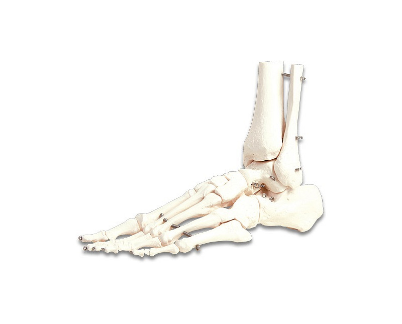 Voetskelet met 10 cm. onderbeen. Beweegbaar model maar kan ook neergezet worden. Materiaal is een natuurgetrouw afgietsel van eersteklas natuurgetrouwe skeletten. Alle anatomische details zijn zichtbaar. Makkelijk schoon te houden.