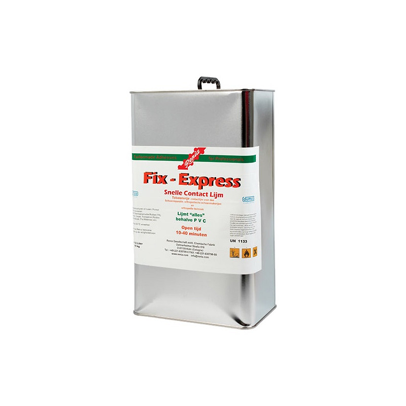 Concurrerende tolueenvrije lijm van Renia. Geschikt voor alle materialen, behalve PVC. Het te verlijmen materiaal eerst ruwen en reinigen, daarna insmeren met Fix Express. Open tijd : 10 tot 40 minuten. Inhoud : 10kg