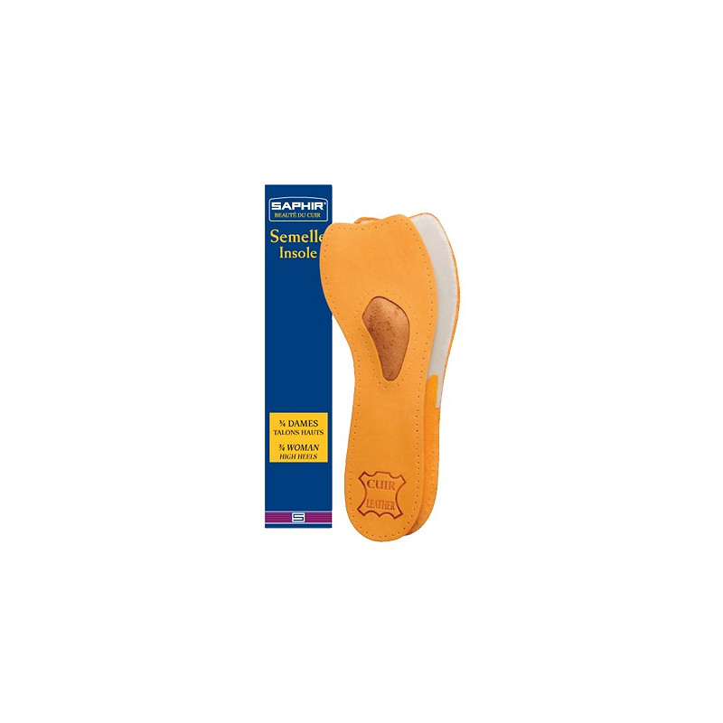 3/4 inlegzool voor damesschoenen met hogere hak. Schaapslederen zool met voorvoetpelot van latex, afgedekt met zacht leer. Zelfklevend.