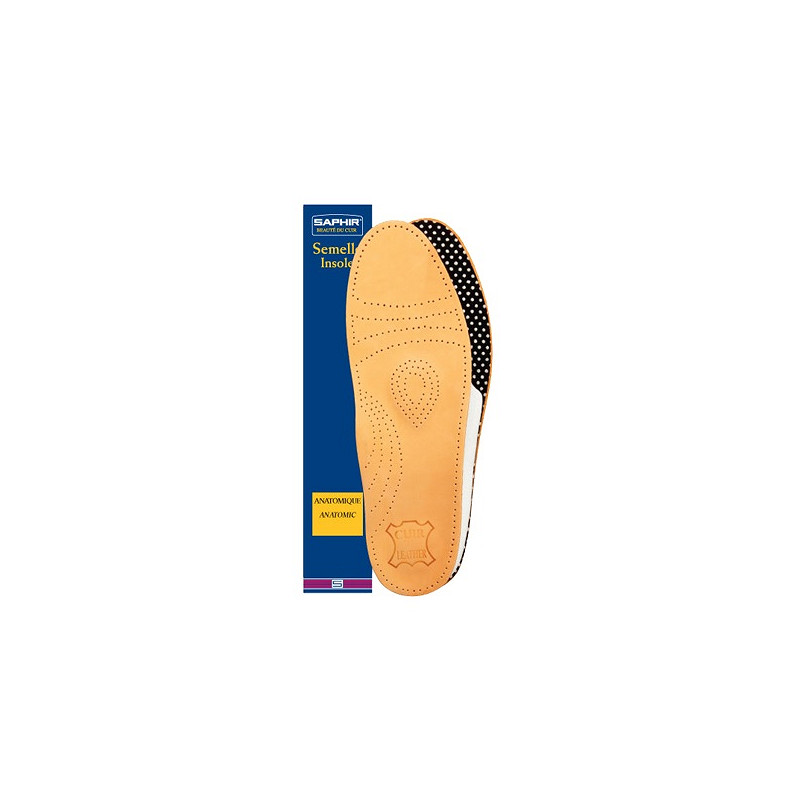 Saphir Anatomique. Anatomisch gebouwde inlegzool met pelot. Bestaat uit hoogwaardige latexelementen, afgedekt met schaapslederen dekje. Voorkomt pijn, stabiliseert de voet, ontspant de tenen. Voetzoolwelving met ondersteuning van de middelvoetsbeentjes.