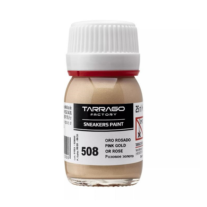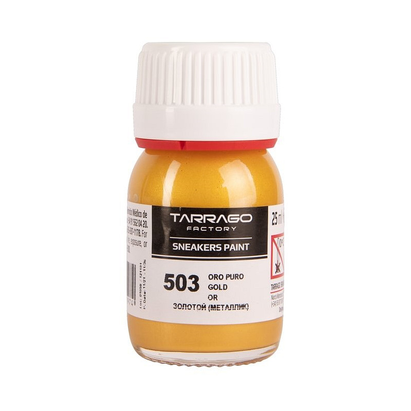 Tarrago Sneakers Paint in metallic kleuren, is een acrylverf op waterbasis speciaal gemaakt om je gladleren, synthetisch leren of canvas sneakers te cusomizen. Het eindresultaat is een glanzende finish, die hoge weerstand biedt tegen natte en droge wrijving. De kleurstof blijft flexibel, waardoor de verf niet scheurt/craqueleert. Door hoge concentratie hoogwaardige pigmenten, weinig lagen nodig voor een dekkend resultaat.Om je kunstwerk nog beter te beschermen, kun je deze afwerken met Tarrago Sneakers Gloss Maker. Deze zorgt voor extra beschermende glans laag. Tarrago Sneakers Paint droogt snel (5-10 minuten).- 25ml- 4 verschillende kleuren- inclusief kwastje, sponsje, doseerdop, folder- niet schadelijk voor gebruiker en het milieu