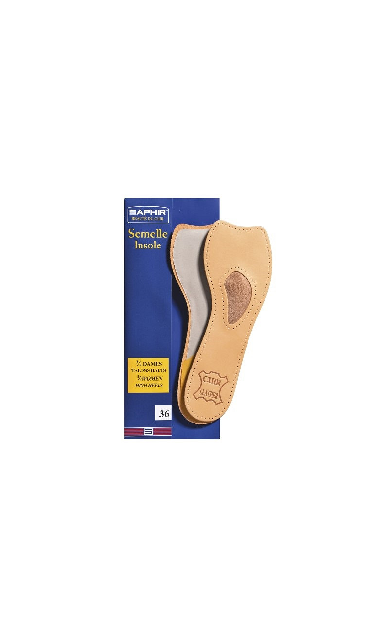 3/4 inlegzool voor damesschoenen met hogere hak. Schaapslederen zool met voorvoetpelot van latex, afgedekt met zacht leer. Zelfklevend.
